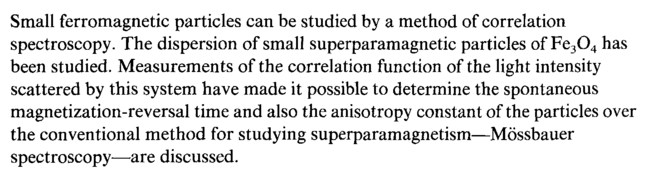 Small ferromagnetic particles can be studied by a method of correlation spectroscopy. The dispersion of small superparamagnetic particles of Fe304 has been studied. Measurements of the correlation function of the light intensity scattered by this system have made it possible to determine the spontaneous magnetization-reversal time and also the anisotropy constant of the particles over the conventional method for studying superparamagnetism—Mossbauer spectroscopy—are discussed.