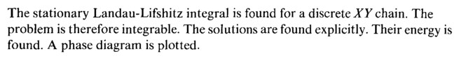 The stationary Landau-Lifshitz integral is found for a discretely chain. The problem is therefore integrable. The solutions are found explicitly. Their energy is found. A phase diagram is plotted.