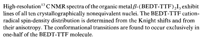 High-resolution13 С NMR spectra of the organic metal β(BEDT-TTF) 2I3 exhibit lines of all ten crystallographically nonequivalent nuclei. The BEDT-TTF cation-radical spin-density distribution is determined from the Knight shifts and from their anisotropy. The conformational transitions are found to occur exclusively in one-half of the BEDT-TTF molecule.