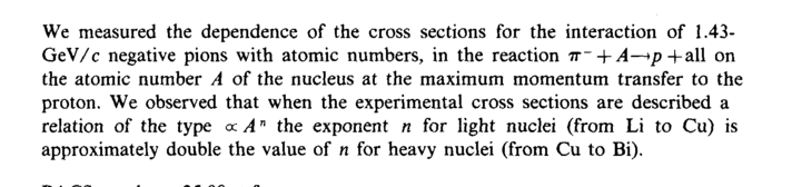 We measured the dependence of the cross sections for the interaction of 1.43-GeV/c negative pions with atomic numbers, in the reaction π~ + Α—ψ -hall on the atomic number A of the nucleus at the maximum momentum transfer to the proton. We observed that when the experimental cross sections are described a relation of the type oz A" the exponent η for light nuclei (from Li to Cu) is approximately double the value of η for heavy nuclei (from Cu to Bi).