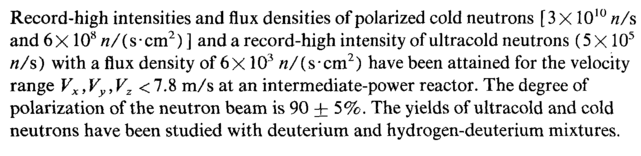 Record-high intensities and flux densities of polarized cold neutrons [3 Χ 1010 n/s and 6 X 108 n/(s · cm2) ] and a record-high intensity of ultracold neutrons (5 X 105 n/s) with a flux density of 6 Χ 103 n/{$-cm2) have been attained for the velocity range VxfVy9Vz < 7.8 m/s at an intermediate-power reactor. The degree of polarization of the neutron beam is 90 ± 5%. The yields of ultracold and cold neutrons have been studied with deuterium and hydrogen-deuterium mixtures.
