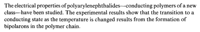 The electrical properties of polyarylenephthalides—conducting polymers of a new class—have been studied. The experimental results show that the transition to a conducting state as the temperature is changed results from the formation of bipolarons in the polymer chain.
