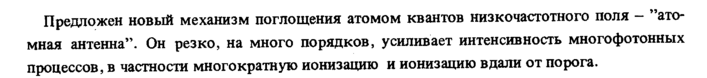 Предложен новый механизм поглощения атомом квантов низкочастотного поля "атомная антенна". Он резко, на много порядков, усиливает интенсивность многофотонных процессов, в частности многократную ионизацию и ионизацию вдали от порога.