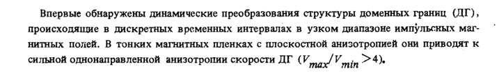 Впервые обнаружены динамические преобразования структуры доменных границ (ДГ), происходящие в дискретных временных интервалах в узком диапазоне импульсных магнитных полей. В тонких магнитных пленках с плоскостной анизотропией они приводят к сильной однонаправленной анизотропии скорости ДГ (V JV . 1>4).