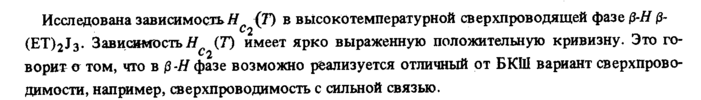 Исследована зависимость Я^{Г) в высокотемпературной сверхпроводящей фазе 0-Я β-(ЕТ)21з. Зависимость # (Τ) имеет ярко выраженную положительную кривизну. Это го-ворит о том, что в β-Η фазе возможно реализуется отличный от БКШ вариант сверхпроводимости, например, сверхпроводимость с сильной связью.