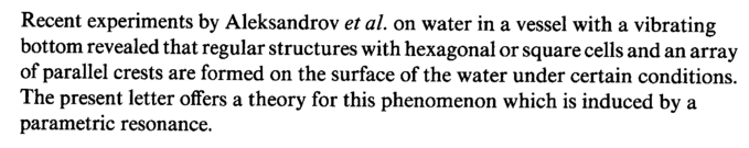 Recent experiments by Aleksandrov et al. on water in a vessel with a vibrating bottom revealed that regular structures with hexagonal or square cells and an array of parallel crests are formed on the surface of the water under certain conditions. The present letter offers a theory for this phenomenon which is induced by a parametric resonance.