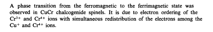 A phase transition from the ferromagnetic to the ferrimagnetic state was observed in CuCr chalcogenide spinels. It is due to electron ordering of the Cr3+ and Cr4* ions with simultaneous redistribution of the electrons among the Cu+ and Cr4^ ions.