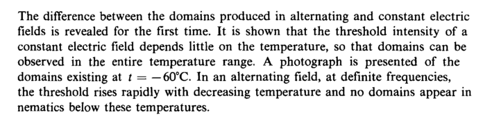 The difference between the domains produced in alternating and constant electric fields is revealed for the first time. It is shown that the threshold intensity of a constant electric field depends little on the temperature, so that domains can be observed in the entire temperature range. A photograph is presented of the domains existing at t = — 60°C. In an alternating field, at definite frequencies, the threshold rises rapidly with decreasing temperature and no domains appear in nematics below these temperatures.