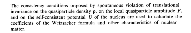 The consistency conditions imposed by spontaneous violation of translational invariance on the quasiparticle density p, on the local quasiparticle amplitude F, and on the self-consistent potential U of the nucleus are used to calculate the coefficients of the Weizsacker formula and other characteristics of nuclear matter.