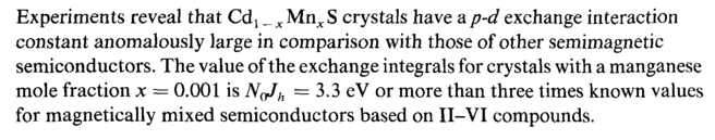 Experiments reveal that Cd± _xMnxS crystals have ap-d exchange interaction constant anomalously large in comparison with those of other semimagnetic semiconductors. The value of the exchange integrals for crystals with a manganese mole fraction χ = 0.001 is N<yJh — 3.3 eV or more than three times known values for magnetically mixed semiconductors based on II-VI compounds.