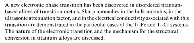 A new electronic phase transition has been discovered in disordered titanium-based alloys of transition metals. Sharp anomalies in the bulk modulus, in the ultrasonic attenuation factor, and in the electrical conductivity associated with this transition are demonstrated in the particular cases of the Ti-Fe and Ti-Cr systems. The nature of the electronic transition and the mechanism for the structural conversion in titanium alloys are discussed.