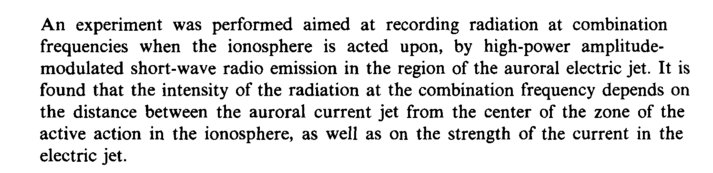 An experiment was performed aimed at recording radiation at combination frequencies when the ionosphere is acted upon, by high-power amplitude-modulated short-wave radio emission in the region of the auroral electric jet. It is found that the intensity of the radiation at the combination frequency depends on the distance between the auroral current jet from the center of the zone of the active action in the ionosphere, as well as on the strength of the current in the electric jet.