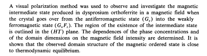 A visual polarization method was used to observe and investigate the magnetic intermediate state produced in dysprosium orthoferrite in a magnetic field when the crystal goes over from the antiferromagnetic state (Gy) into the weakly ferromagnetic state (GXFZ). The region of the existence of the intermediate state is outlined in the (HT) plane. The dependences of the phase concentrations and of the domain dimensions on the magnetic field intensity are determined. It is shown that the observed domain structure of the magnetic ordered state is close to thermodynamic equilibrium.