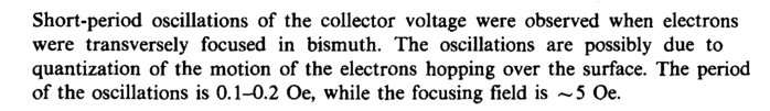 Short-period oscillations of the collector voltage were observed when electrons were transversely focused in bismuth. The oscillations are possibly due to quantization of the motion of the electrons hopping over the surface. The period of the oscillations is 0.1-0.2 Oe, while the focusing field is —5 Oe.