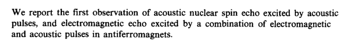 We report the first observation of acoustic nuclear spin echo excited by acoustic pulses, and electromagnetic echo excited by a combination of electromagnetic and acoustic pulses in antiferromagnets.