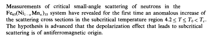 Measurements of critical small-angle scattering of neutrons in the Fe65(Ni1_xMnx)35 system have revealed for the first time an anomalous increase of the scattering cross sections in the subcritical temperature region 4.2 < T< T0< Tc. The hypothesis is advanced that the depolarization effect that leads to subcritical scattering is of antiferromagnetic origin.