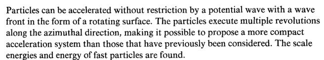 Particles can be accelerated without restriction by a potential wave with a wave front in the form of a rotating surface. The particles execute multiple revolutions along the azimuthal direction, making it possible to propose a more compact acceleration system than those that have previously been considered. The scale energies and energy of fast particles are found.