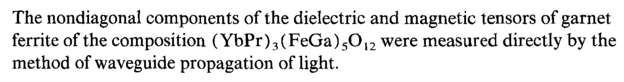 The nondiagonal components of the dielectric and magnetic tensors of garnet ferrite of the composition (YbPr)3(FeGa)5012 were measured directly by the method of waveguide propagation of light.