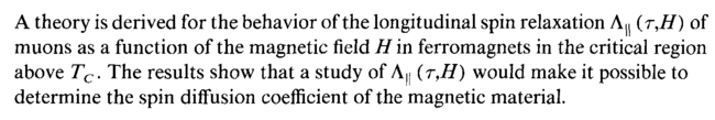 A theory is derived for the behavior of the longitudinal spin relaxation ìà (r,i/) of muons as a function of the magnetic field Η in ferromagnets in the critical region above Tc. The results show that a study of ìà (τ,Η) would make it possible to determine the spin diffusion coefficient of the magnetic material.