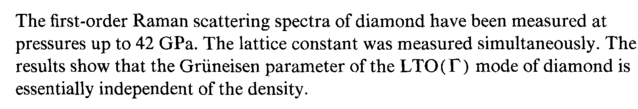 The first-order Raman scattering spectra of diamond have been measured at pressures up to 42 GPa. The lattice constant was measured simultaneously. The results show that the Griineisen parameter of the LTO (Γ) mode of diamond is essentially independent of the density.