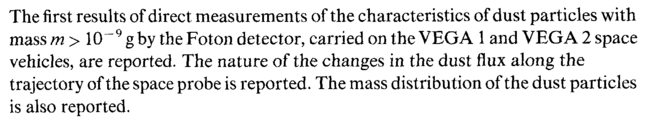The first results of direct measurements of the characteristics of dust particles with mass m > 10~9 g by the Foton detector, carried on the VEGA 1 and VEGA 2 space vehicles, are reported. The nature of the changes in the dust flux along the trajectory of the space probe is reported. The mass distribution of the dust particles is also reported.