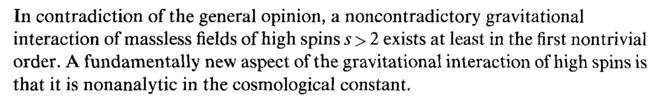 In contradiction of the general opinion, a noncontradictory gravitational interaction of massless fields of high spins s > 2 exists at least in the first nontrivial order. A fundamentally new aspect of the gravitational interaction of high spins is that it is nonanalytic in the cosmological constant.