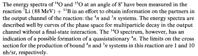 The energy spectra of 140 and 150 at an angle of 8° have been measured in the reaction 7Li (88 MeV) + UB in an effort to obtain information on the partners in the output channel of the reaction: the 4n and 3n systems. The energy spectra are described well by curves of the phase space for multiparticle decay in the output channel without a final-state interaction. The 140 spectrum, however, has an indication of a possible formation of a quasistationary 4n. The limits on the cross section for the production of bound 4n and 3n systems in this reaction are 1 and 10 nb/sr, respectively.