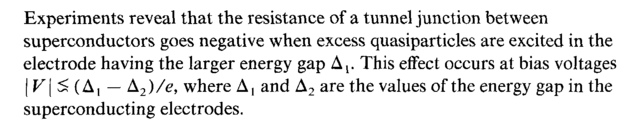 Experiments reveal that the resistance of a tunnel junction between superconductors goes negative when excess quasiparticles are excited in the electrode having the larger energy gap Δ{. This effect occurs at bias voltages I V\ ^ (Δι — Δ2)/β, where Δ, and Δ2 are the values of the energy gap in the superconducting electrodes.