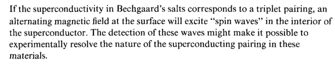 If the superconductivity in Bechgaard's salts corresponds to a triplet pairing, an alternating magnetic field at the surface will excite "spin waves" in the interior of the superconductor. The detection of these waves might make it possible to experimentally resolve the nature of the superconducting pairing in these materials.