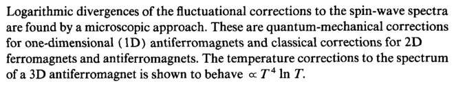 Logarithmic divergences of the fluctuational corrections to the spin-wave spectra are found by a microscopic approach. These are quantum-mechanical corrections for one-dimensional (ID) antiferromagnets and classical corrections for 2D ferromagnets and antiferromagnets. The temperature corrections to the spectrum of a 3D antiferromagnet is shown to behave ос Τ4 In T.
