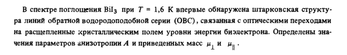 В спектре поглощения B1I3 при Τ = 1,6 К впервые обнаружена штарковская структура линий обратной водородоподобной серии (ОВС), связанная с оптическими переходами на расщепленные кристаллическим полем уровни энергии биэлектрона. Определены значения параметров анизотропии А и приведенных масс μ и д„ .