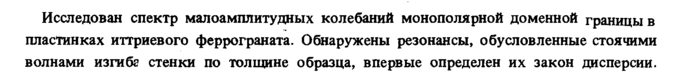 Исследован спектр малоамплитудных колебаний монополярной доменной границы в пластинках иттриевого феррограната. Обнаружены резонансы, обусловленные стоячими волнами изгибе стенки по толщине образца, впервые определен их закон дисперсии.