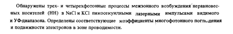 Обнаружены трехи четырехфотонные процессы межзонного воз буж дения'не равновесных носителей (НН) в NaCl и КС1 пи ко секундными лазерными импульсами видимого и УФ-диапазона. Определены соответствующие коэффициенты многофотонного поглощения и подвижности электронов в зоне проводимости.