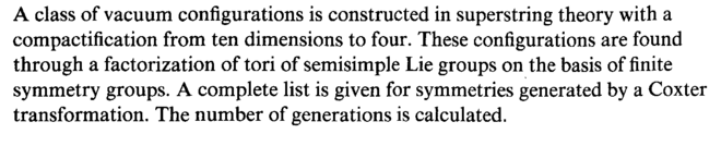 A class of vacuum configurations is constructed in superstring theory with a compactification from ten dimensions to four. These configurations are found through a factorization of tori of semisimple Lie groups on the basis of finite symmetry groups. A complete list is given for symmetries generated by a Coxter transformation. The number of generations is calculated.