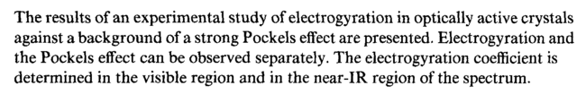 The results of an experimental study of electrogyration in optically active crystals against a background of a strong Pockels effect are presented. Electrogyration and the Pockels effect can be observed separately. The electrogyration coefficient is determined in the visible region and in the near-IR region of the spectrum.
