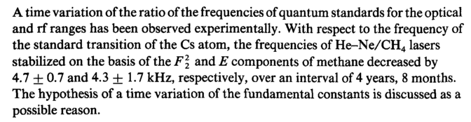 A time variation of the ratio of the frequencies of quantum standards for the optical and rf ranges has been observed experimentally. With respect to the frequency of the standard transition of the Cs atom, the frequencies of He-Ne/CH4 lasers stabilized on the basis of the F\ and Ε components of methane decreased by 4.7 ± 0.7 and 4.3 + 1.7 kHz, respectively, over an interval of 4 years, 8 months. The hypothesis of a time variation of the fundamental constants is discussed as a possible reason.