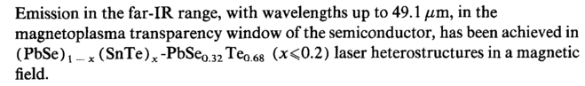 Emission in the far-IR range, with wavelengths up to 49.1 μηι, in the magnetoplasma transparency window of the semiconductor, has been achieved in (PbSe) t _ x (SnTe)x -PbSe0.32TeQ.68 (*<0.2) laser heterostructures in a magnetic field.