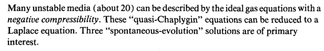 Many unstable media (about 20) can be described by the ideal gas equations with a negative compressibility. These "quasi-Chaplygin" equations can be reduced to a Laplace equation. Three "spontaneous-evolution" solutions are of primary interest.