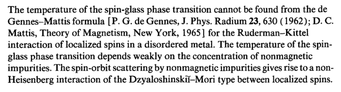 The temperature of the spin-glass phase transition cannot be found from the de Gennes-Mattis formula [P. G. de Gennes, J. Phys. Radium 23,630 (1962); D. C. Mattis, Theory of Magnetism, New York, 1965] for the Ruderman-Kittel interaction of localized spins in a disordered metal. The temperature of the spin-glass phase transition depends weakly on the concentration of nonmagnetic impurities. The spin-orbit scattering by nonmagnetic impurities gives rise to a non-Heisenberg interaction of the Dzyaloshinskii-Mori type between localized spins.