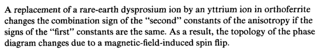 A replacement of a rare-earth dysprosium ion by an yttrium ion in orthoferrite changes the combination sign of the "second" constants of the anisotropy if the signs of the "first" constants are the same. As a result, the topology of the phase diagram changes due to a magnetic-field-induced spin flip.