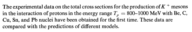 The experimental data on the total cross sections for the production of К + mesons in the interaction of protons in the energy range Tp = 800-1000 MeV with Be, C, Cu, Sn, and Pb nuclei have been obtained for the first time. These data are compared with the predictions of different models.
