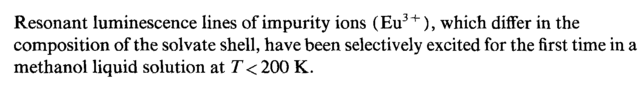 Resonant luminescence lines of impurity ions (Eu3+), which differ in the composition of the solvate shell, have been selectively excited for the first time in a methanol liquid solution at T< 200 K.