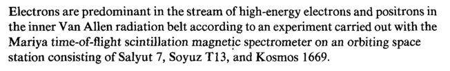 Electrons are predominant in the stream of high-energy electrons and positrons in the inner Van Allen radiation belt according to an experiment carried out with the Mariya time-of-flight scintillation magnetic spectrometer on an orbiting space station consisting of Salyut 7, Soyuz Τ13, and Kosmos 1669.