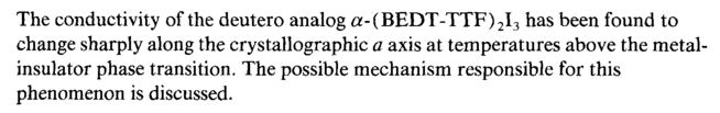 The conductivity of the deutero analog #-(BEDT-TTF)2l3 has been found to change sharply along the crystallographic a axis at temperatures above the metal-insulator phase transition. The possible mechanism responsible for this phenomenon is discussed.