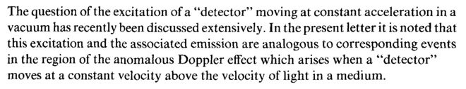 The question of the excitation of a "detector" moving at constant acceleration in a vacuum has recently been discussed extensively. In the present letter it is noted that this excitation and the associated emission are analogous to corresponding events in the region of the anomalous Doppler effect which arises when a "detector" moves at a constant velocity above the velocity of light in a medium.