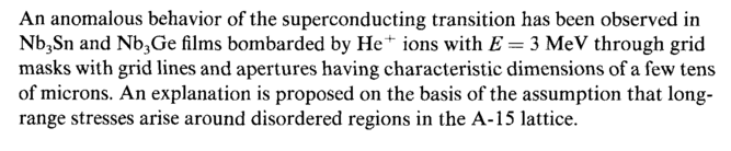 An anomalous behavior of the superconducting transition has been observed in Nb3Sn and Nb3Ge films bombarded by He+ ions with Ε = 3 MeV through grid masks with grid lines and apertures having characteristic dimensions of a few tens of microns. An explanation is proposed on the basis of the assumption that long-range stresses arise around disordered regions in the A-15 lattice.
