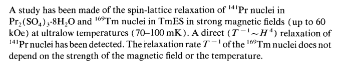 A study has been made of the spin-lattice relaxation of 14,Pr nuclei in Pr2(S04)3-8H20 and 169Tm nuclei in TmES in strong magnetic fields (up to 60 kOe) at ultralow temperatures (70-100 mK). A direct (T~l ~H4) relaxation of 14 *Pr nuclei has been detected. The relaxation rate Τ ~1 of the 169Tm nuclei does not depend on the strength of the magnetic field or the temperature.
