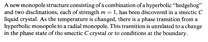 A new monopole structure consisting of a combination of a hyperbolic "hedgehog" and two disclinations, each of strength m = 1, has been discovered in a smectic С liquid crystal. As the temperature is changed, there is a phase transition from a hyperbolic monopole to a radial monopole. This transition is unrelated to a change in the phase state of the smectic С crystal or to conditions at the boundary.