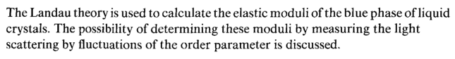 The Landau theory is used to calculate the elastic moduli of the blue phase of liquid crystals. The possibility of determining these moduli by measuring the light scattering by fluctuations of the order parameter is discussed.
