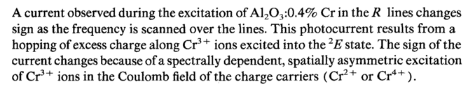 A current observed during the excitation of Al2O3:0.4% Cr in the R lines changes sign as the frequency is scanned over the lines. This photocurrent results from a hopping of excess charge along Cr3 + ions excited into the 2 Ε state. The sign of the current changes because of a spectrally dependent, spatially asymmetric excitation of Cr3+ ions in the Coulomb field of the charge carriers (Cr2+ or Cr4 +).